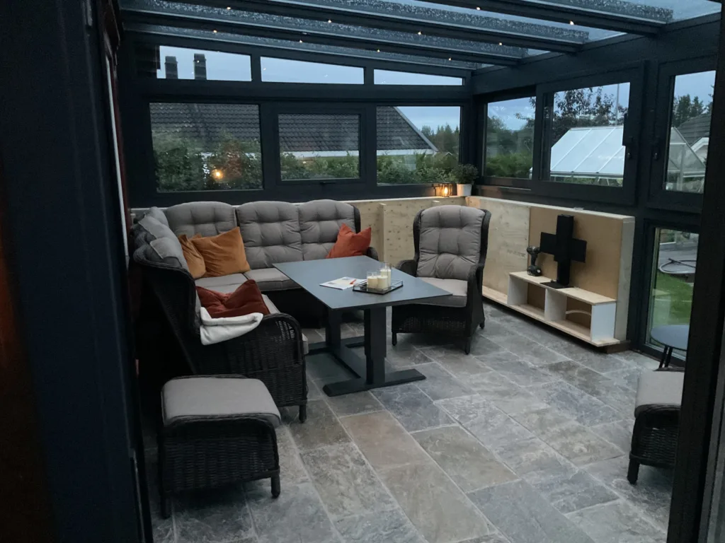 En lys og trivelig oase vi kan bruke året rundt, uansett vær. Foldedøren er en genial løsning som gir oss mulighet til å åpne opp rommet fullstendig på varme dager, mens det integrerte LED-lyset i taket skaper en fantastisk stemning på kveldstid.